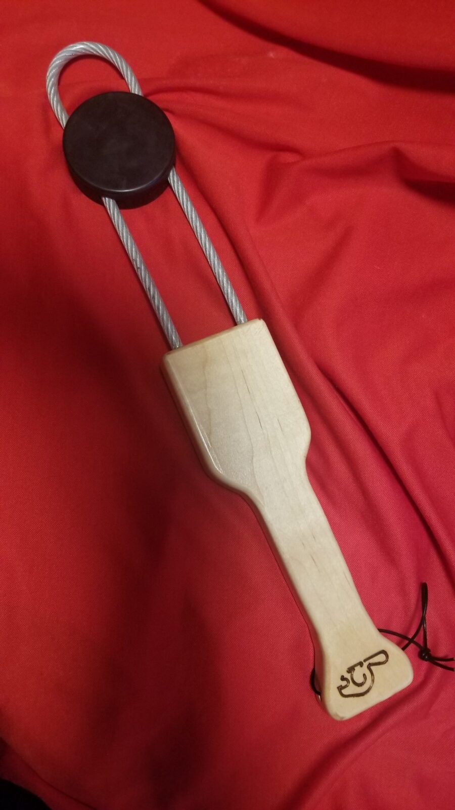 This a hand-crafted “Give a Puck” – maple & hockey puck paddle, with a stingy thud! Handle is maple and the business end is a real hockey puck mounted on a 3/8″ coated wire, all wood has rounded edges and a clear finish. The overall length of this toy is about 20″ and comes with black leather lanyard.