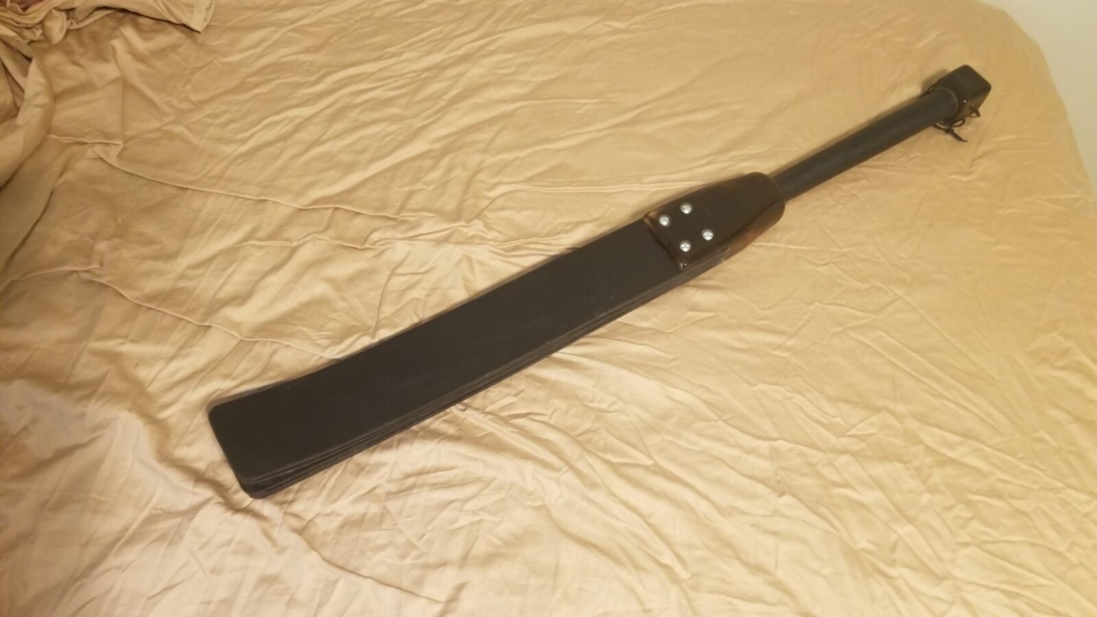 A hand-turned hardwood handle holding several pieces of 12 oz harness leather. The overall length is about 36 ” for the ultimate thud!